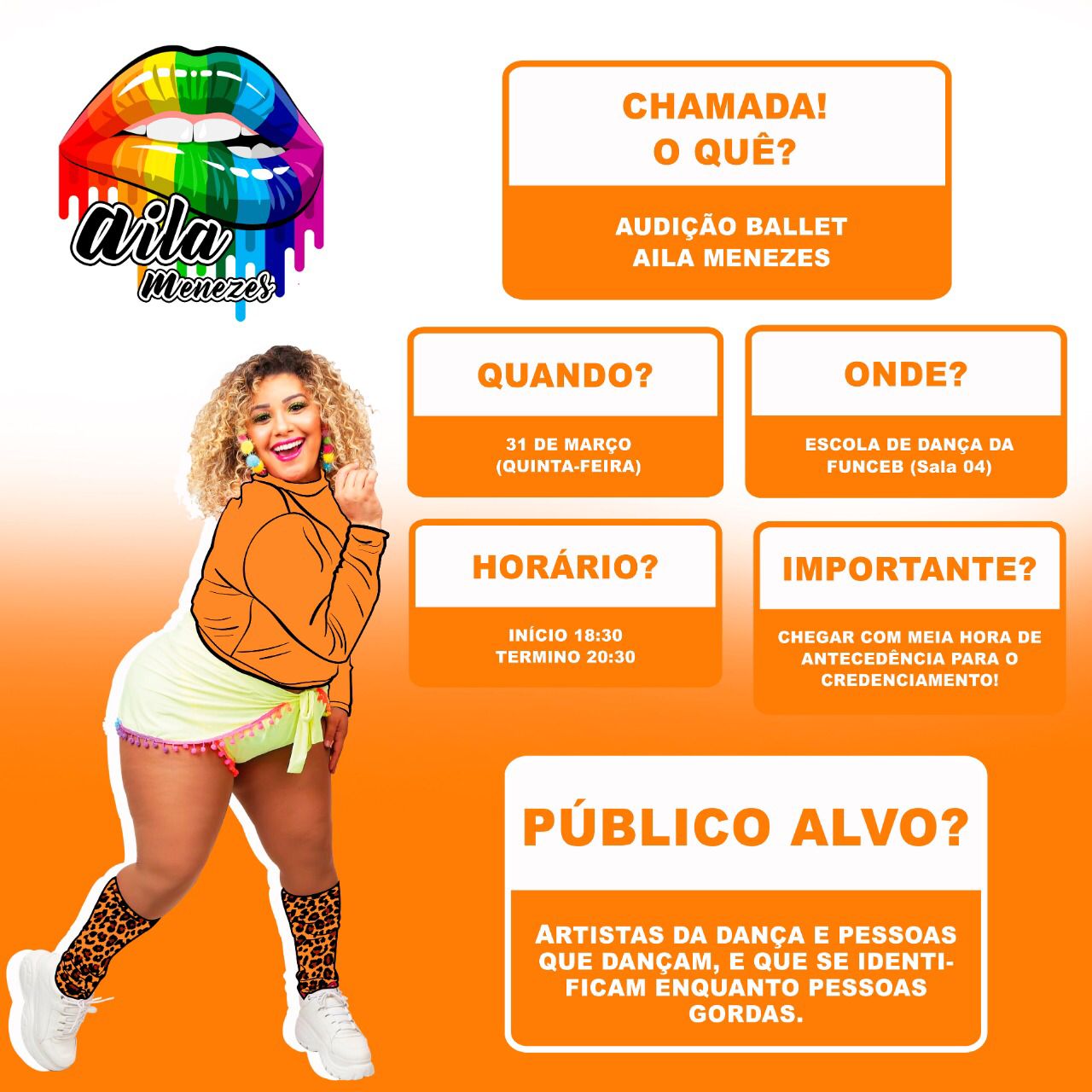A cantora Aila Menezes realiza, na próxima quinta-feira (31) , ás 13h na sede Funceb no Pelourinho audição para seleção do seu corpo de ballet. A audição é voltada para dançarinos e pessoas gordas.