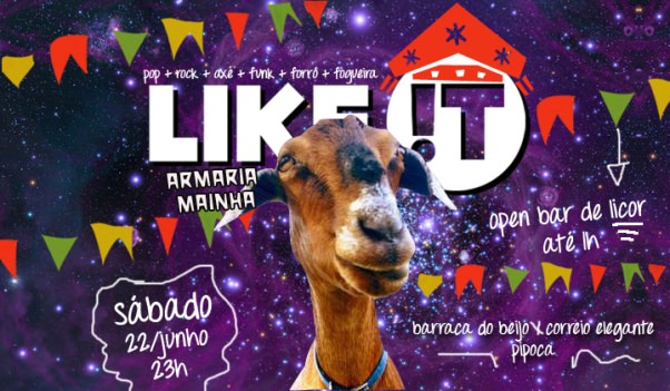 No sábado (22), a Like !T entra em clima de São João, homenageando um dos memes mais famosos entre os frequentadores de redes sociais na Bahia, o Armaria Mainha, às 23h. A festa tem open bar de licor até 1h e contará até com barraca do beijo, correio elegante e pipoca! Convidando todos a aparecerem de xadrez, os DJs Albert Elliot, Caco, Fabiano Saft e Izabela Ruas prometem muito forró e os tradicionais pop, rock, funk e brega na pista de dança.