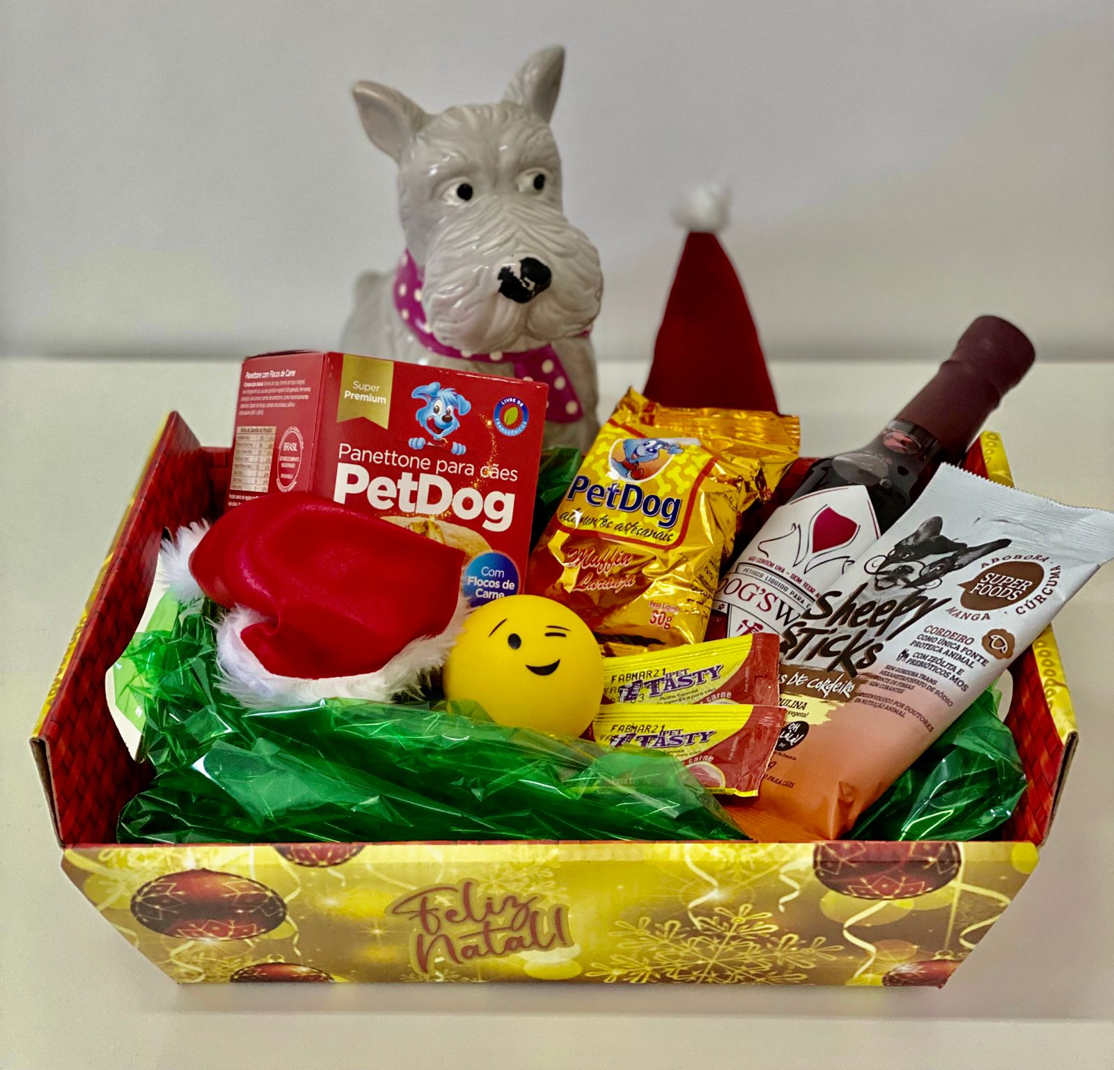Custa R$ 72 e inclui: um vinho sabor carne (próprio para cães), um muffin, um stick / petisco, um gorro natalino, uma bolinha smile, dois molhos pra ração e até um panettone canino.