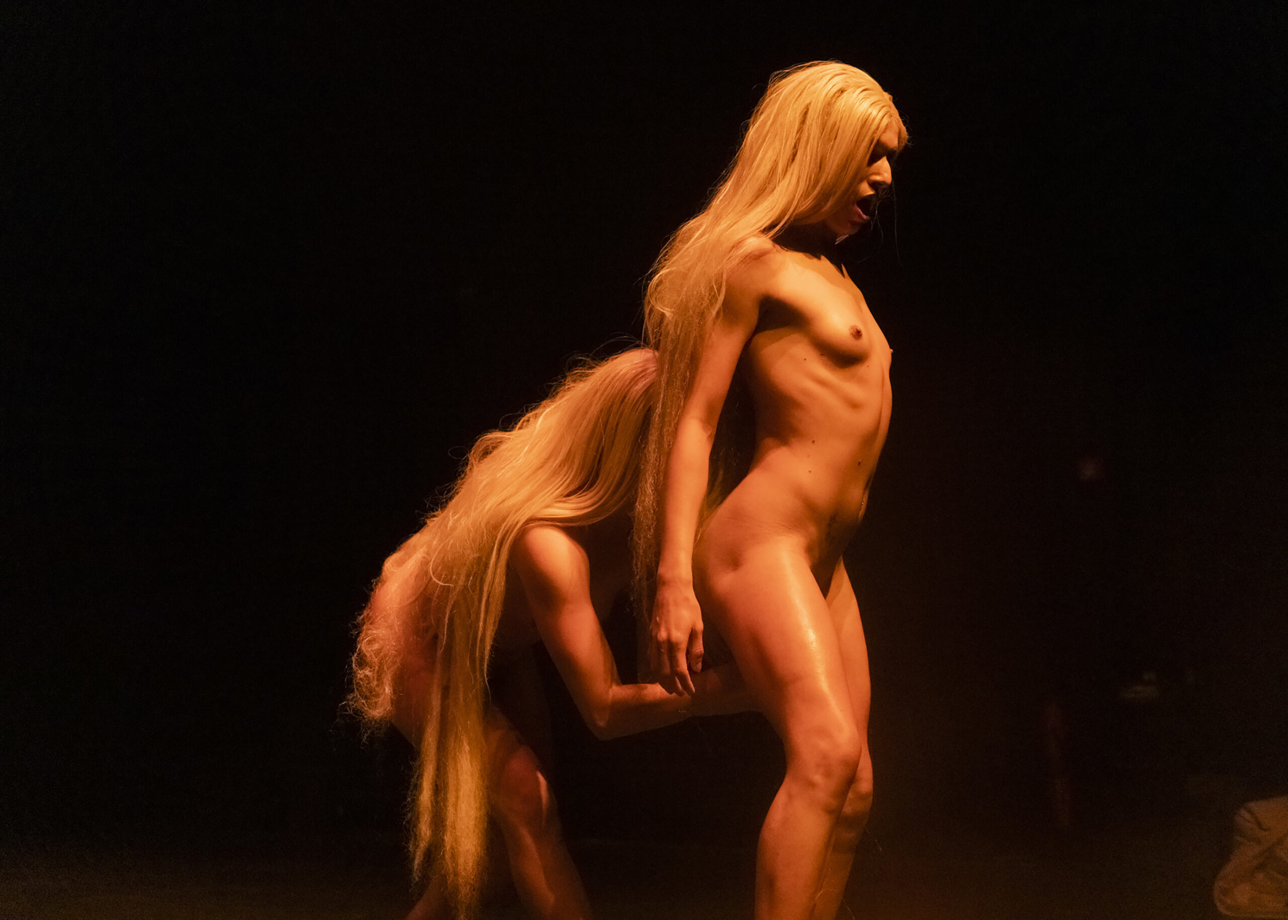Sinopse: “Eunucos” reflete sobre processos de castrações históricas, tecnologias de transição e performance de gênero. Duas existências, dois cavalos selvagens, duas sereias, duas ninfas e duas liliths negociando vida e desejos, atravessando o tempo e espaço e ativando um ritual de morte e ressurreição. As corpas passam por micro e macro cirurgias ao vivo, nos acidentes provocados e recebidos por elas. Nesta peça, o público não é um agente passivo, e também se posiciona diante dos conflitos de relação ativados pela performance.