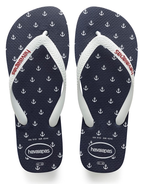 Top Nautical – sempre um grande sucesso na coleção – agora traz mais uma estampa com âncoras no fundo azul marinho, tira branca e logo na cor vermelha. E a sandália ainda possui extensão na numeração infantil, para pais e filhos saírem combinando.