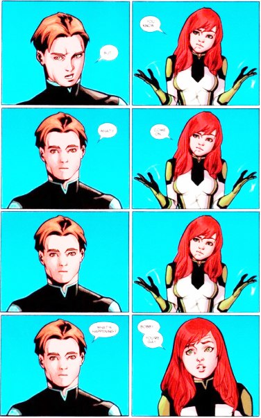 “Talvez ele (no futuro) não conseguisse lidar com o fato de ser mutante e gay em uma sociedade que tem problemas com os dois”, revela. Jean Grey decide ler a mente do rapaz: “Bobby, você é gay”, diz a ruiva.