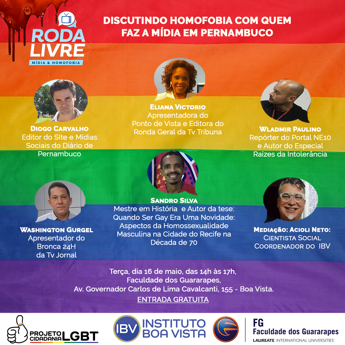 As notícias sobre crimes e violência, fruto do preconceito contra os LGBTs sempre mereceu destaque da imprensa. Mas até que ponto os veículos de comunicação divulgam de forma correta as informações? Essa pergunta e outros questionamentos serão debatidos nesta terça-feira (16), das 14h às 17h, no Roda Livre sobre ‘Mídia e Homofobia’ promovido pelo Instituto Boa Vista, que acontecerá no auditório da Faculdade dos Guararapes, Campus Boa Vista. Para a mesa foram convidados renomados jornalistas: Eliana Victorio (TV Tribuna), Wladmir Paulino (Portal NE 10 do Sistema Jornal do Commercio), Washington Gurgel (TV Jornal) e Diogo Carvalho (Diario de Pernambuco), além do historiador Sandro Silva.