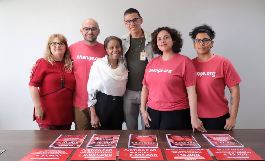 A equipe da plataforma de abaixo-assinados Change.org se reuniu, na manhã de terça-feira (16), com o Ministério dos Direitos Humanos e Cidadania para entregar cinco petições que acumulam quase 6 milhões de assinaturas em pedidos de direitos para pessoas trans e travestis; de justiça para vítimas de racismo; e conclusão para o caso Dom e Bruno.