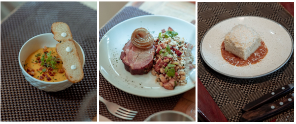 Já no prato principal, as opções são Medalhão de mignon duroc com molho cítrico e purê de batata-doce (filé mignon de porco com molho cítrico a base de tangerina, laranja e especiarias, com purê de batata-doce) ou Bife de tavalozza com risoto ao pomodoro e basílico (miolo da paleta sem gordura grelhado e servido com o risoto de tomates).