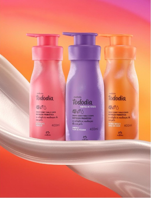 As três fragrâncias tropicais são inspiradas em cada momento do verão. Natura Tododia Manga Rosa & Água de Coco traz a energia vibrante do meio-dia, com notas frescas e frutadas que despertam os sentidos, enquanto Natura Tododia Acerola & Hibisco evoca a exuberância do pôr do sol, envolta por um perfume cítrico e radiante. Já o novo Natura Tododia Amora e Flor de Pêssego desperta todo romantismo e autenticidade das noites quentes do verão, com uma fragrância floral adocicada e envolvente.