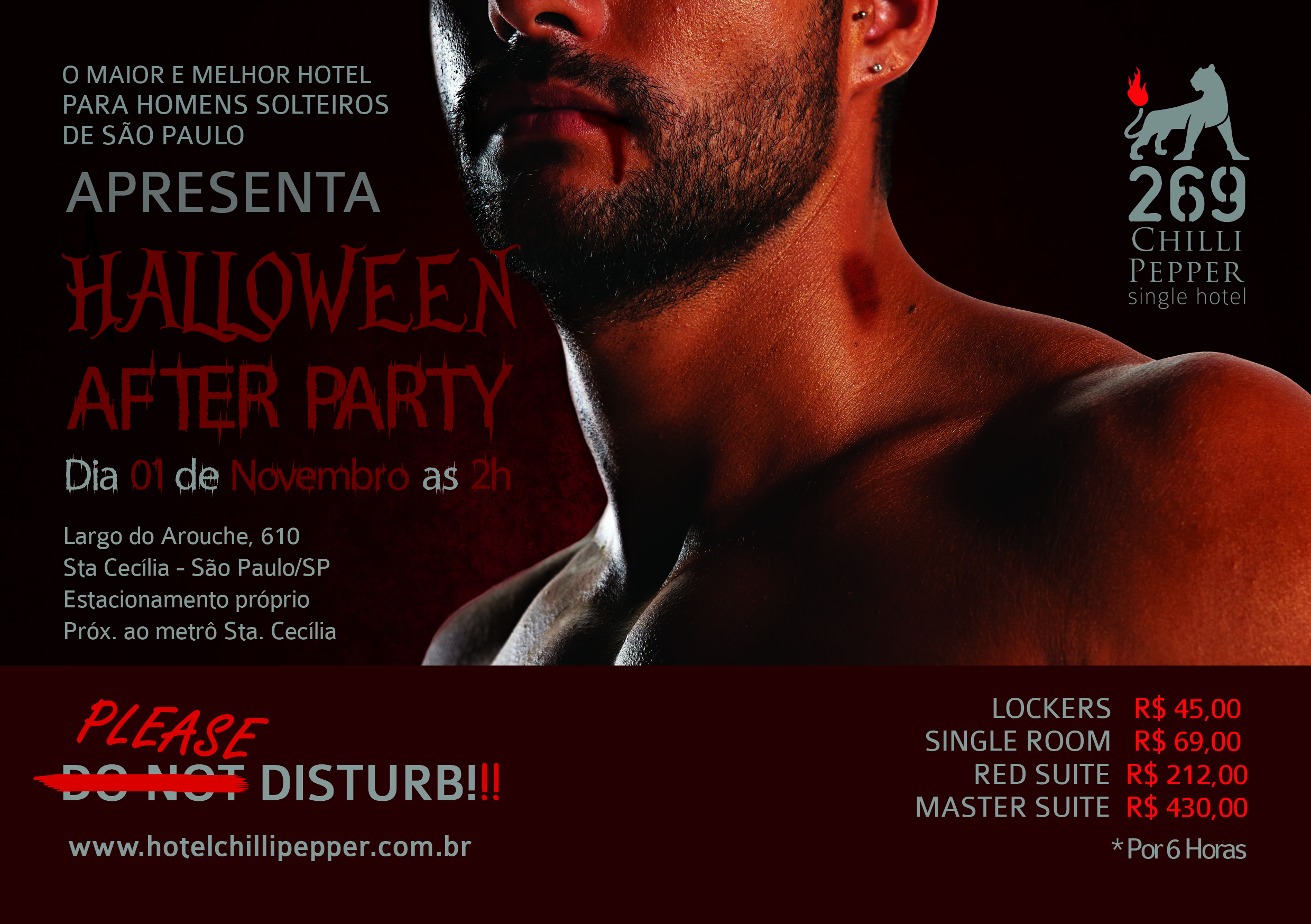 O Halloween no maior hotel para solteiros da América Latina vai ser pra lá de animado. O 269 Chilli Pepper vai promover uma festa especial na madrugada de sexta – feira para quem quiser estender a sua balada de Dia das Bruxas.