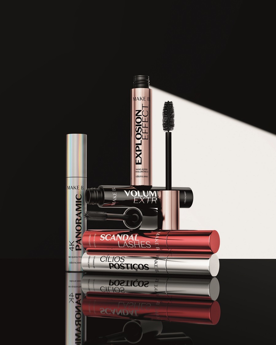 O destaque de lançamento se dá com a Make B. Explosion Effect, com nanoácido hialurônico, que define e torna os fios mais espessos. A máscara entrega 999% mais volume, 300% mais curvatura, 400% mais alongamento. Com 11h de duração, é resistente – não transfere, não escorre, nem borra –, mas tem fácil remoção com água morna.