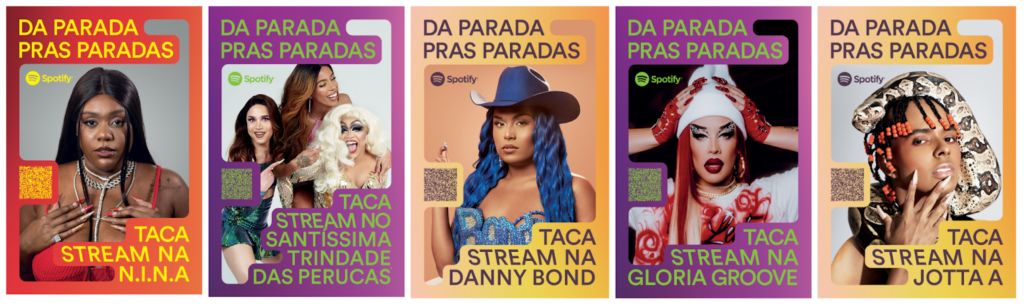 Neste Mês do Orgulho LGBT, o Spotify lança duas iniciativas para promover artistas e criadores de conteúdo LGBTQIAP+ nacionais no universo do áudio. Entre os dias 14 e 20 de junho, a campanha Da Parada Pras Paradas apresenta uma série de mídia out of home (OOH) estrelada por artistas e podcasters da comunidade de todas as regiões do Brasil, incentivando o público a descobrir e escutar mais criadores da comunidade e contribuindo para que protagonizem as Paradas de música e as Paradas de podcasts do Spotify.