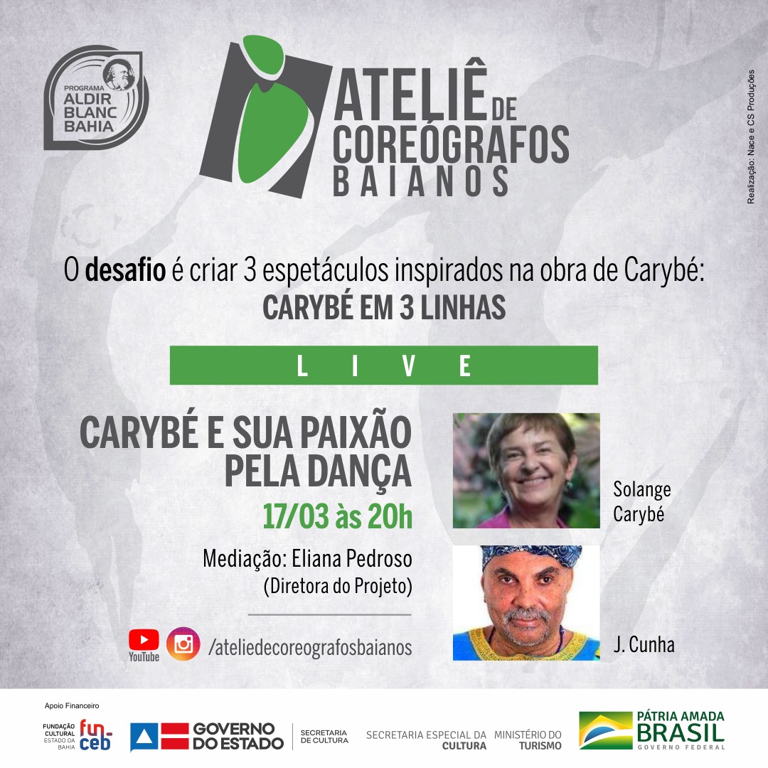 Dia 17 de março, às 20h, no YouTube e no Instagram do Ateliê de Coreógrafos Baianos, acontece a live Carybé e sua paixão pela dança. Vamos conversar com a filha do ilustrador, Solange Carybé, com o artista visual e cenógrafo J. Cunha, parceiro do pintor, e com a bailarina, gestora cultural e responsável pela concepção dos dois Ateliês, Eliana Pedroso.