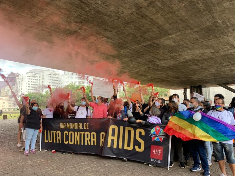 Para marcar o Dia Mundial de Luta Contra Aids, ativistas se encontraram no vão do MASP, em São Paulo e protestaram contra estigma, discriminação e retrocessos na política de aids, além da diminuição do número de testagens devido à pandemia.