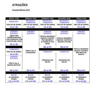A VARANDA ELÉTRICA, já uma tradição do EXPRESSO 2222, será comandada por PRETA GIL algumas noites. Nas outras, a produção pretende prestigiar a prata da casa, ou seja, artistas baianos sob o comando de MARCIA CASTRO. Quem vai abrir a VARANDA ELETRICA é DEL FELIZ que produziu um jingle para o camarote deste ano.