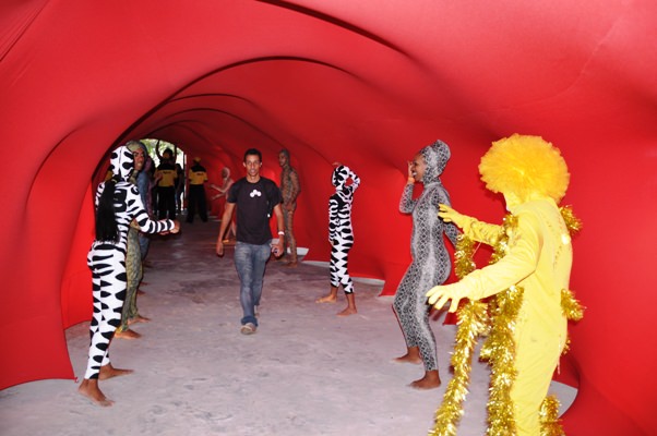Na entrada do evento, o túnel vermelho com personagens performáticos dava as boas vindas com uma experiência sensorial.
