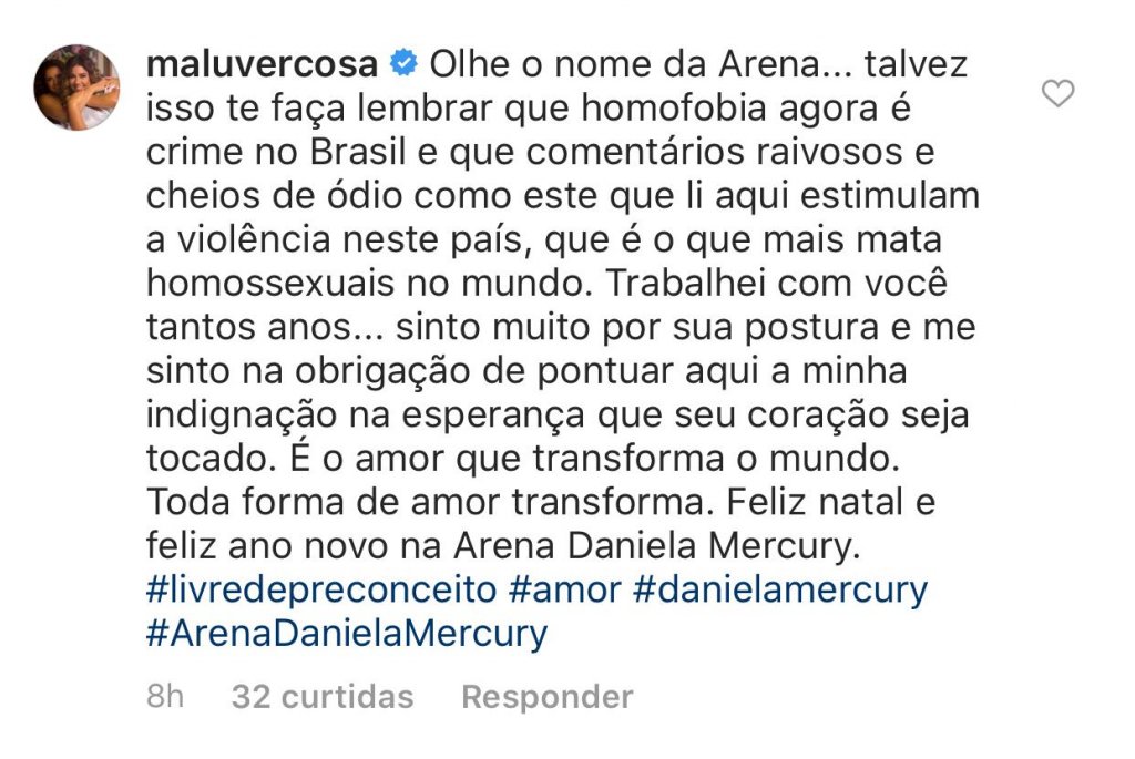 A jornalista Malu Verçosa esposa da cantora Daniela Mercury se manifestou diante da atitude do colega de profissão .