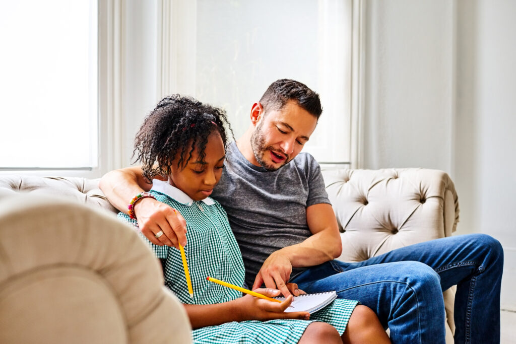 Portrait of transgender man with daughter explaining how to do homework. Both sitting together on sofa.