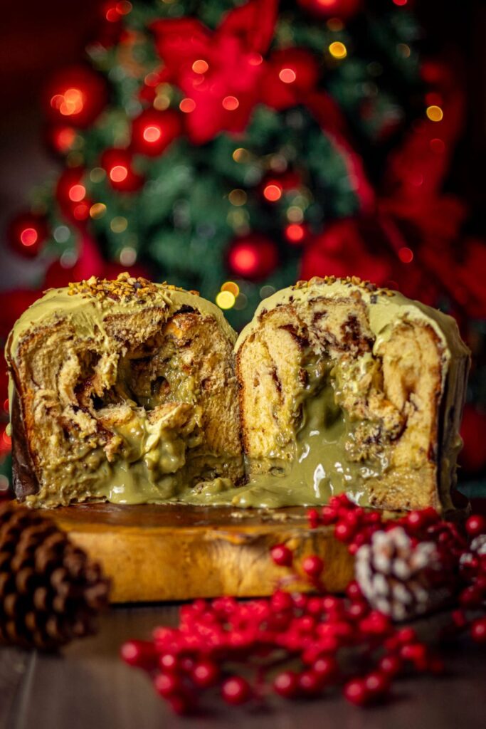 Panettone al Pistacchio – com generoso recheio cremoso de pistache com leite ninho e gotas de chocolate belga.