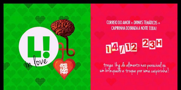 No sábado (14), é dia de espalhar amor na edição especial da LIKE !T In Love, às 23h. Trilha sonora caprichada, caipirinha dobrada a noite toda, e Correio do Amor vão facilitar você a terminar o ano com a pessoa desejada. E como a vibe é essa, traga um brinquedo ou 1 kg de alimento não perecível e troque por 1 caipirinha no bar. A doação será repassada a uma instituição de caridade. A troca (1 por pessoa) dura até 1h.