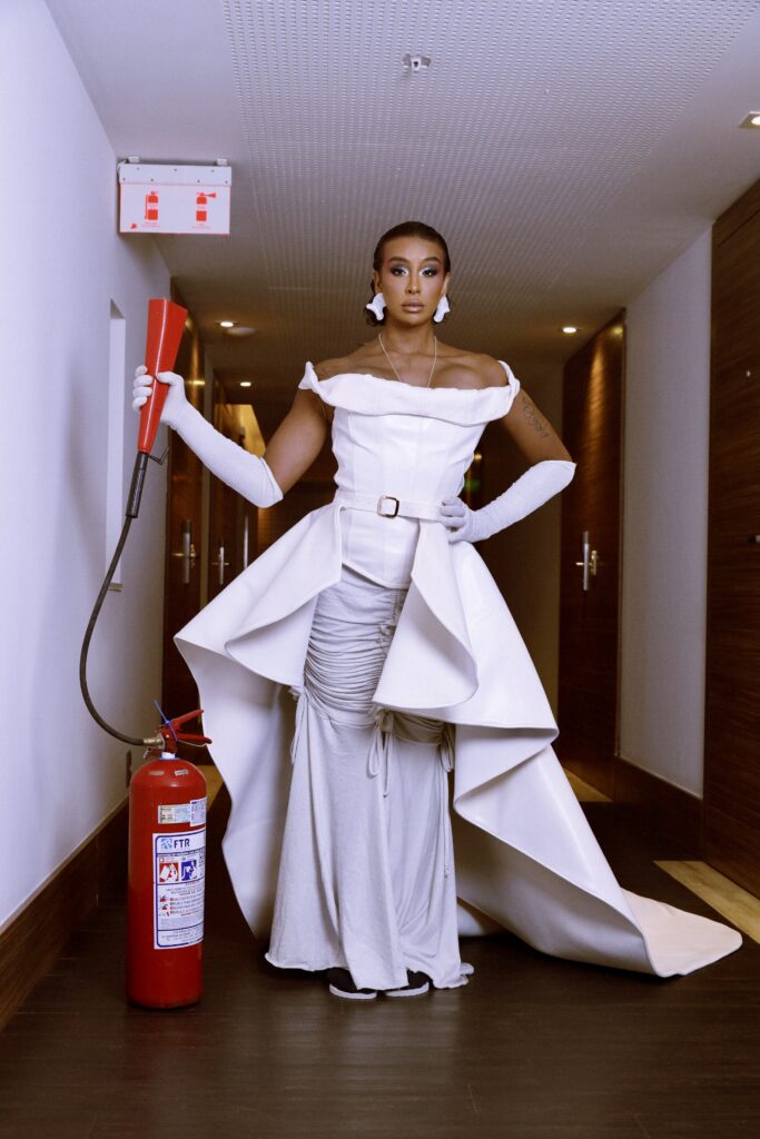 Com base criativa nas diversidades culturais afro-brasileiras, Hisan e Pedro prepararam para a artista um vestido em collab com os stylists Katriel e Isac da Membrana. O look que fez referência às flores, veio com o DNA de streetwear e paleta de cores da Dendezeiro, representando a estrutura de uma rosa branca, de uma maneira mais leve com a dualidade de uma flor virada para cima e uma flor virada para baixo.