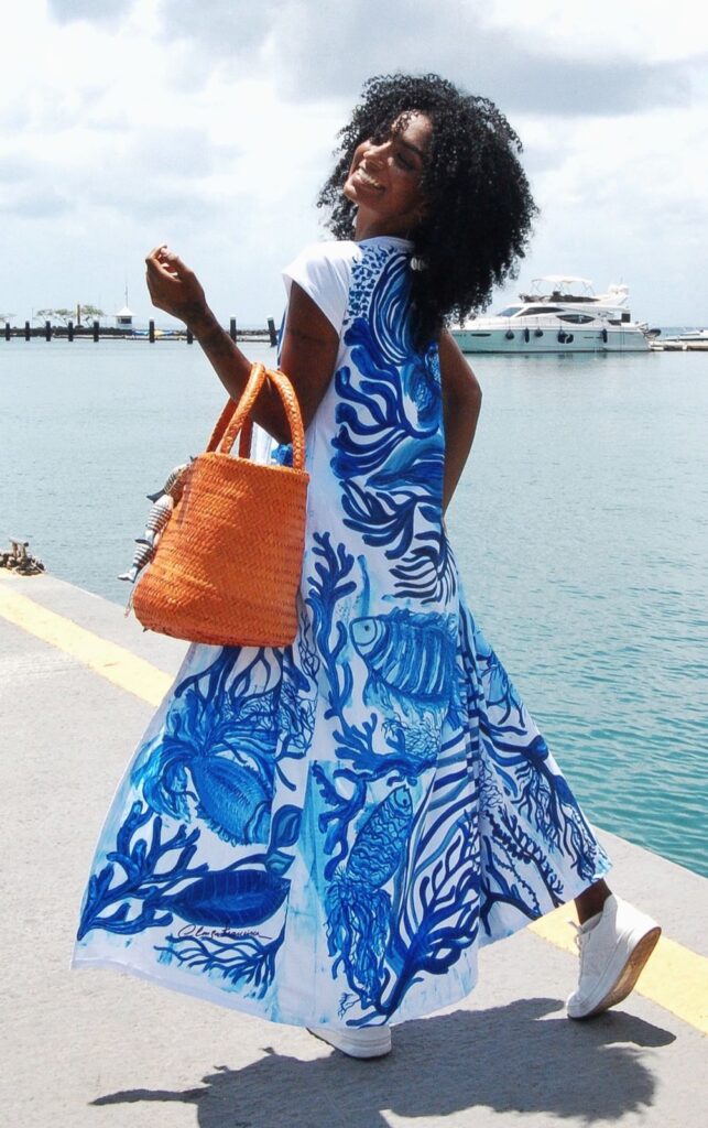 Com estampas de corais, conchas, búzios, cavalos marinhos, polvos e estrela do mar, as peças são assinadas pela artista plástica têxtil Cleuza Francisca, que há 40 anos trabalha como estilista e empresária no setor da moda.