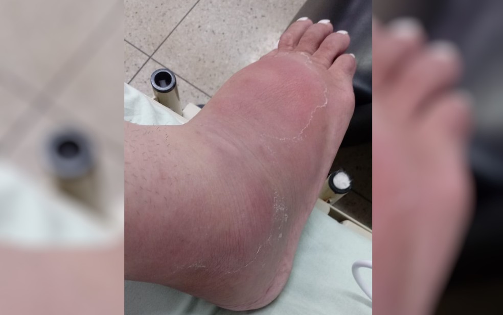 Luara Butielles está com pé inchado após silicone se deslocar, em Goiás — Foto: Luara Butielles Nunes/Arquivo pessoal