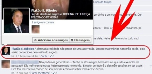 “Desses casamentos (homossexuais) nascerão cocôs, pois serão concebidos pela saída do esgoto”. Este foi o post do juiz Platão Ribeiro, de Anápolis (GO), no Facebook, referente a vitória da comunidade LGBT com a aprovação da união homoafetiva no Uruguai.