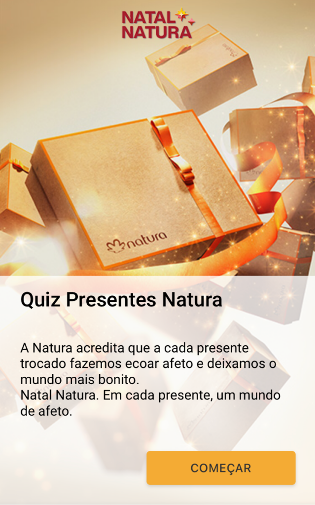 A missão de presentear quem se ama no Natal ficou muito mais fácil.A Natura acaba de lançar, pela primeira vez, o Quiz de Natal Natura, uma ferramenta para ajudar clientes e Consultoras de Beleza Natura a escolher o presente natalino ideal de acordo com o perfil de quem vai recebê-lo e a faixa de preço desejada. E o melhor: a experiência pode ser acessada tanto nas versões desktop e mobile quanto via assistente de voz do Google.