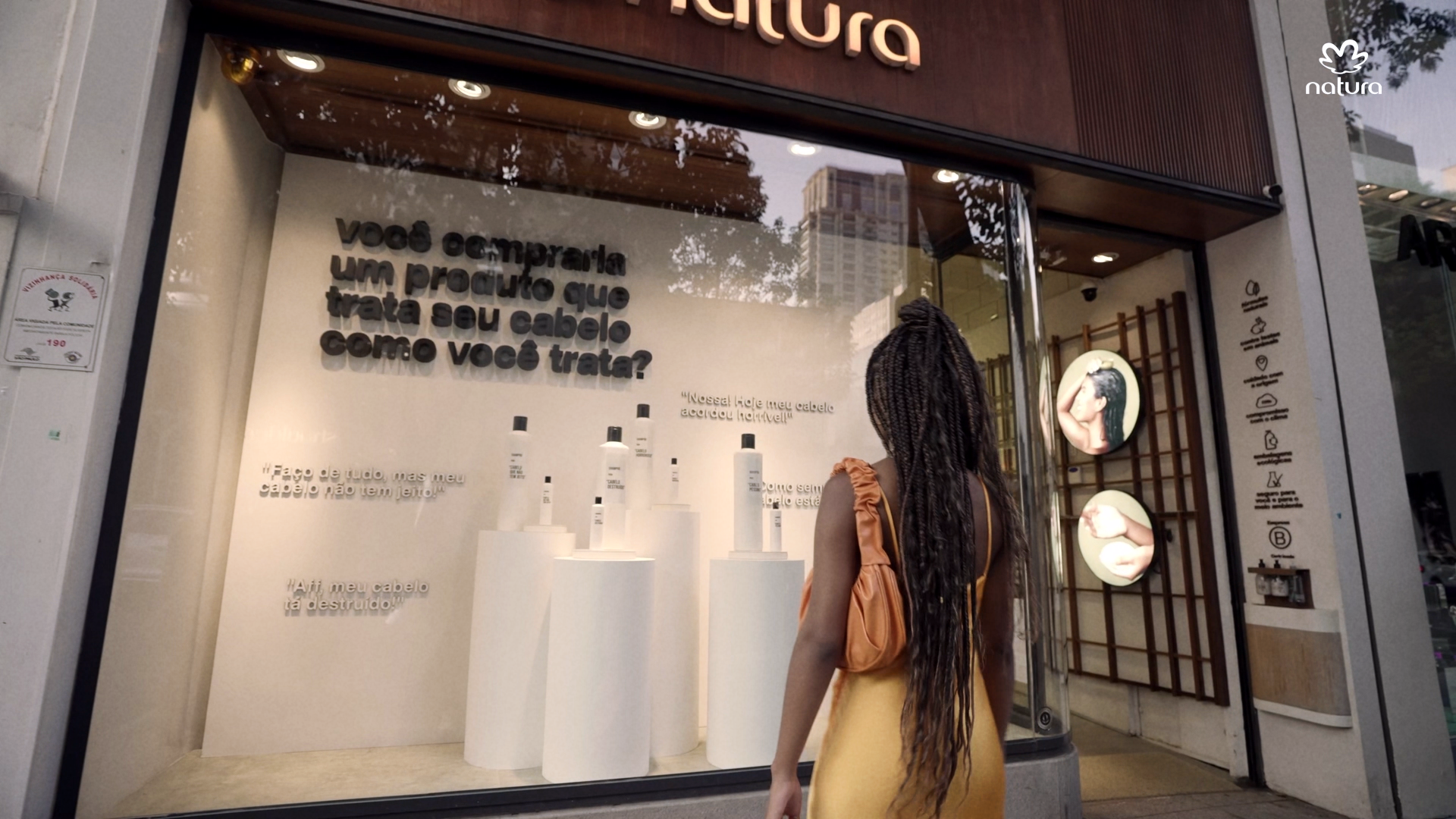 A vitrine da loja da Natura localizada na rua Oscar Freire, em São Paulo, também provocou as mulheres que passaram por lá a se questionarem sobre a maneira que tratam os seus cabelos. Na vitrine, a marca brinca com embalagens fakes que simulam frases que mulheres costumam falar sobre seus cabelos. Já no interior da loja, todas as clientes, ao lado do apoio das vendedoras, podem encontrar os produtos da linha para que os seus fios recebam o tratamento adequado.