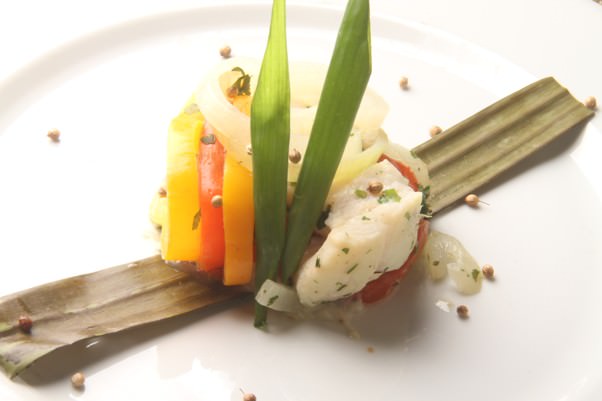 Da cultura Indígena…peixe na folha de bananeira Filet de linguado cortado em cubos grandes, limões espremidos, cebolinha verde picada, pimenta dedo de moça, salsinha picada, leite de coco, pimentão verde picada, cebola rodelas, tomate cubos, semente de coentro, sal, folha de bananeira.