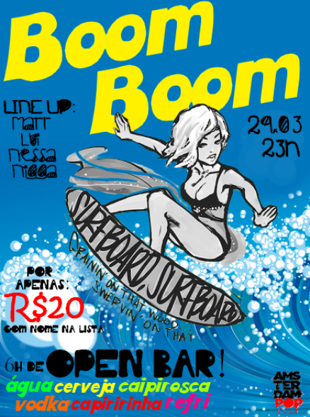 No sábado, 29 de fevereiro, a festa BoomBoom está de volta e com SEIS HORAS de OPEN BAR de cerveja, vodka, água, refrigerante, caipirinha e caipirosca em todo o clube, a partir das 23h. Os DJs Matt, Lui, Nessa e Nigga comandam a pista até as primeiras horas do domingo, de frente para a Baía de Todos os Santos.