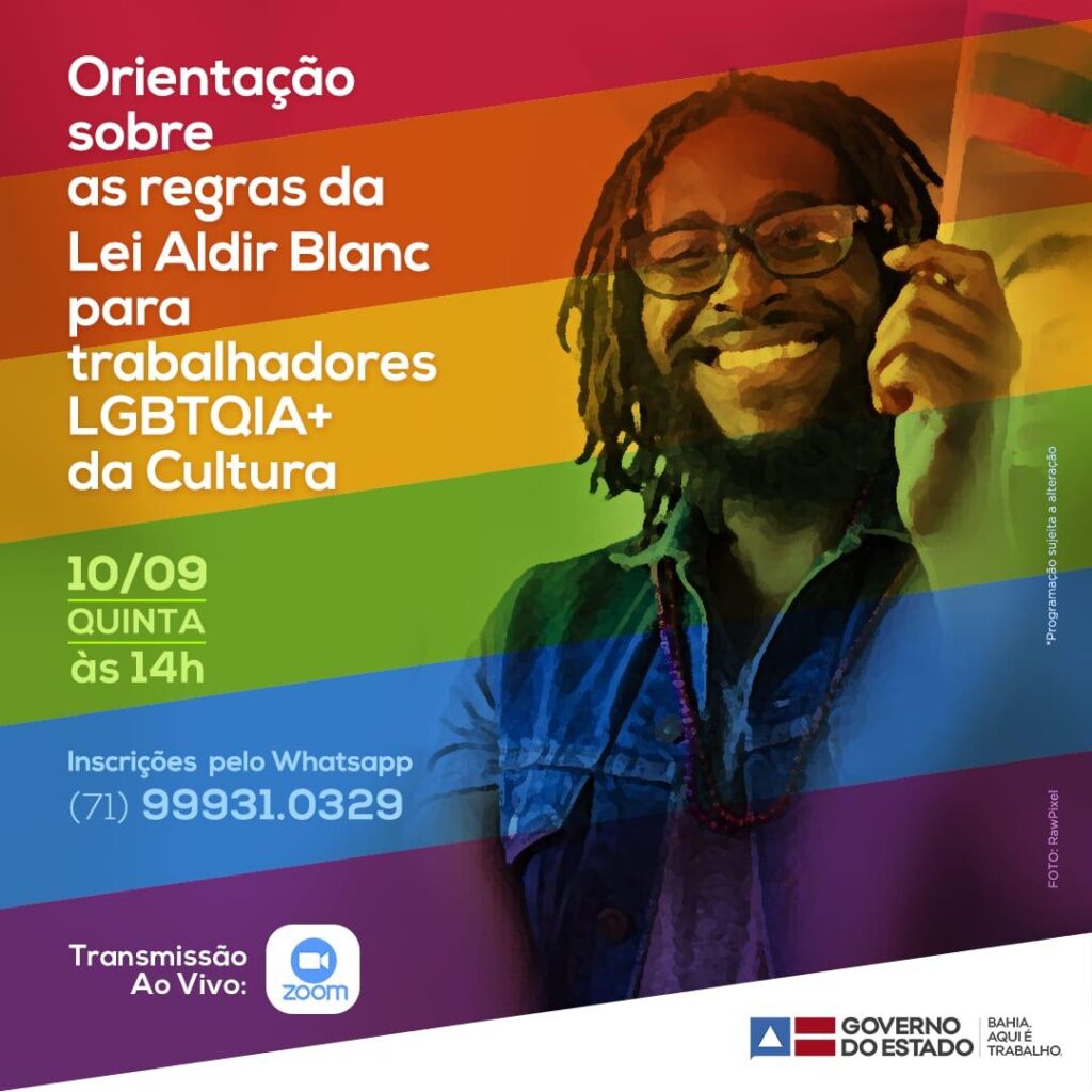 A Lei Aldir Blanc tem como objetivo estabelecer ajuda emergencial para artistas, coletivos e empresas que atuam no setor cultural e atravessam dificuldades financeiras durante a pandemia. Para orientar sobre como acessar os benefícios (não há como indicar como se dará o acesso ao recurso ainda), a Secretaria de Justiça, Direitos Humanos e Desenvolvimento Social (SJDHDS), juntamente com a Secretaria de Cultura (SecultBA), promovem nesta quinta-feira (10), às 14h, Reunião de Orientação voltada para trabalhadores LGBTQIA+ do campo da cultura na Bahia.