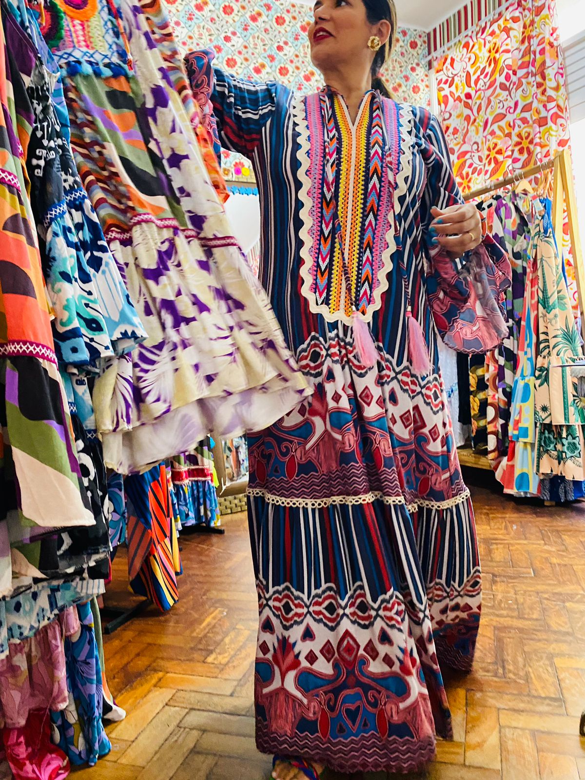 “Nosso espaço de criação e produção, que é nosso ateliê, é um sonho. Todo mundo que tem a oportunidade de visitar, se encanta. Tudo tem a cara da marca, com muita cor, muitas texturas, deixando o ambiente inspirador e a equipe sempre inspirada”, conta Adriana. Além disso, a criadora da marca de moda feminina comenta sobre a relação com as comunidades de artesãs. “Temos relação com esses diversos grupos de artesanatos, tanto na Bahia, quanto em outros estados. Valorizamos muito isso e fazemos um trabalho social, de profissionalização muito grande com essas pessoas. É a nossa forma de enxergar e de valorizar esses profissionais essenciais”, analisa ela.