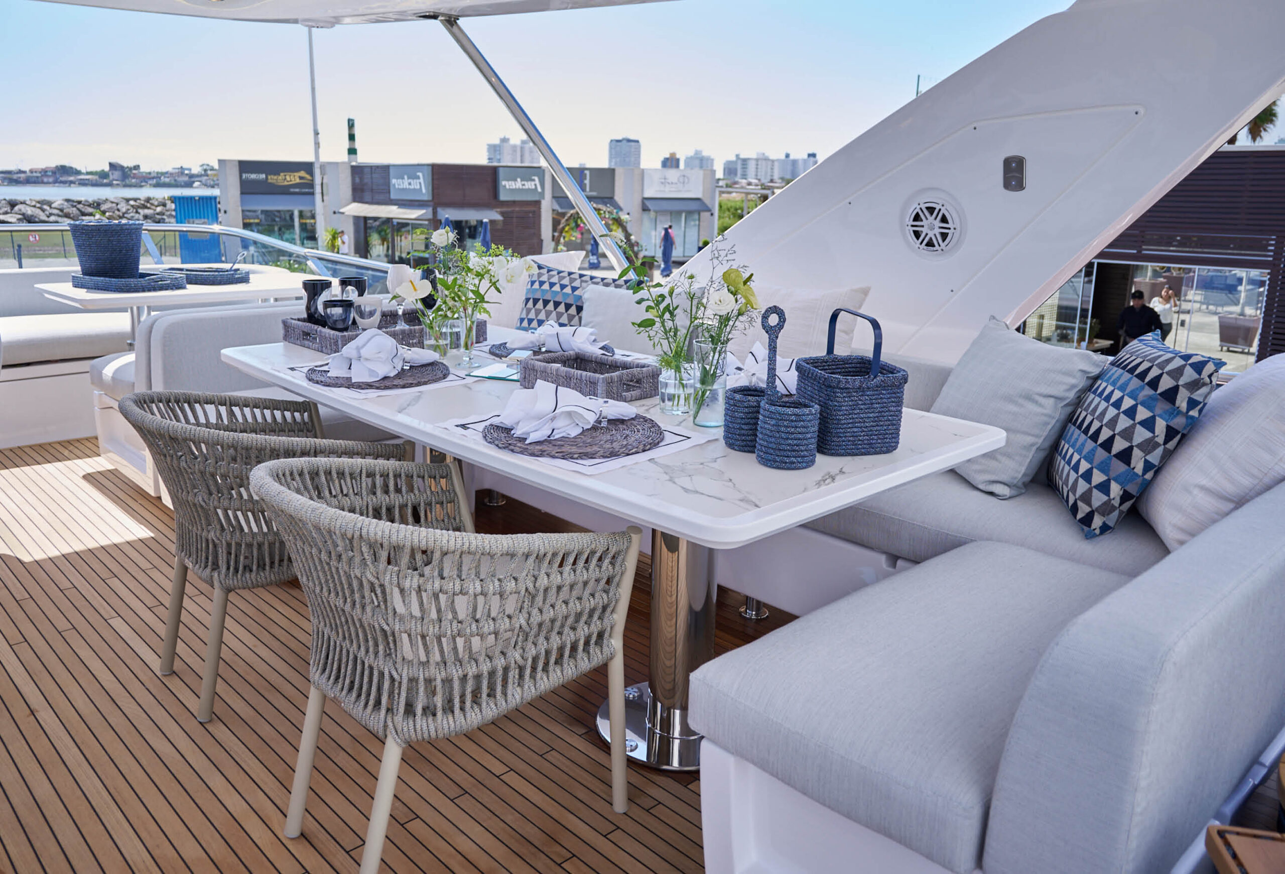 Dentre as peças mais desejadas para as embarcações estão as mais compactas, que não ocupam tanto espaço, porém são funcionais, como a chaise e as cadeiras Kauai, o banco multiuso que pode virar um cooler e até mesmo uma mesa de apoio, além de peças decorativas como cestos e acessórios para mesa com revestimento em corda náutica e os tapetes que ajudam a proteger e não deixar que esquente muito a teca, que é a madeira natural usada no piso dos barcos.