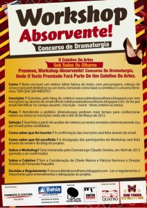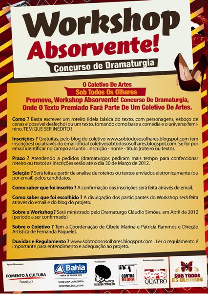 O Coletivo Sob Todos os Olhares promove em Salvador o “Workshop Absorvente! Concurso de Dramaturgia”. Este projeto inicia as atividades deste coletivo que através de uma linguagem leve e divertida, reúne teatro, música, dança, vídeo, artes plásticas e fotografia. Todas as artes serão apresentadas de forma simultânea, no mesmo ambiente, todos interligados e essencialmente independentes. As inscrições estão abertas até o dia 30 de março de 2012.