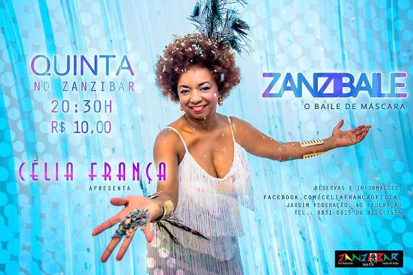 Nesta Quinta feira (20), acontece a abertura do ZANZIBAILE – O Baile de Máscara, um projeto da cantora baiana Célia França. O Baile de máscaras terá início as 20:30h no Restaurante Zanzibar, localizado no Jardim Federação – Federação.